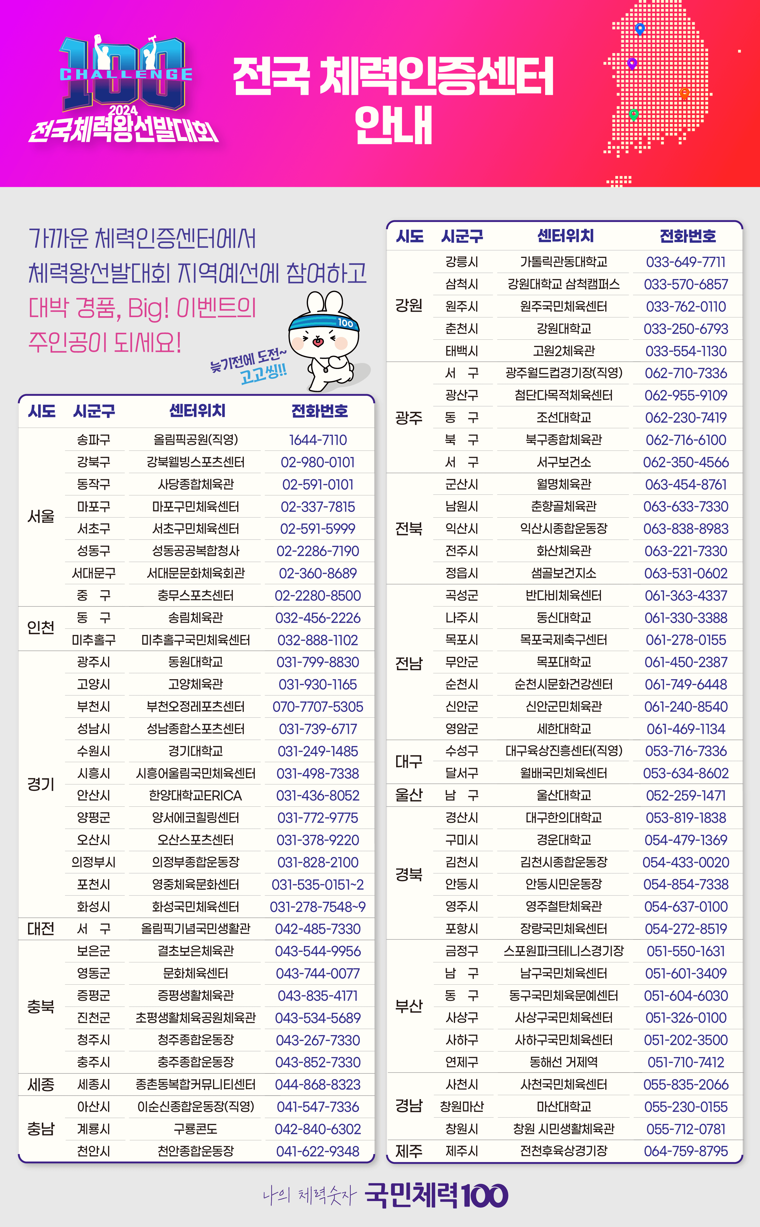 국민체력 100에서 <2024년 전국 체력왕 선발대회>가 열립니다. 대한민국의 국민이라면 누구나 참여가 가능하고, 가까운 국민체력인증센터에서 전국체력왕선발대회에 도전하세요.