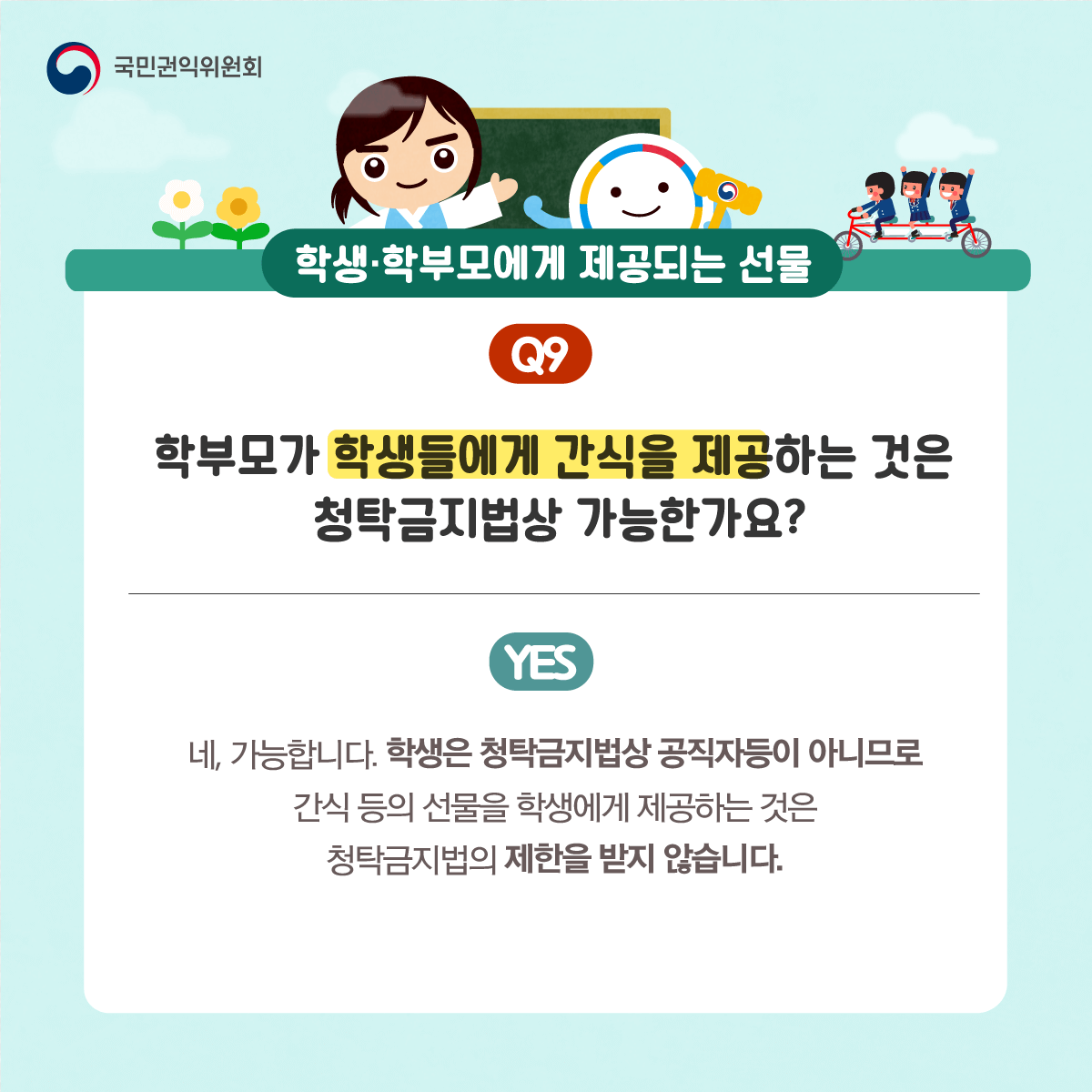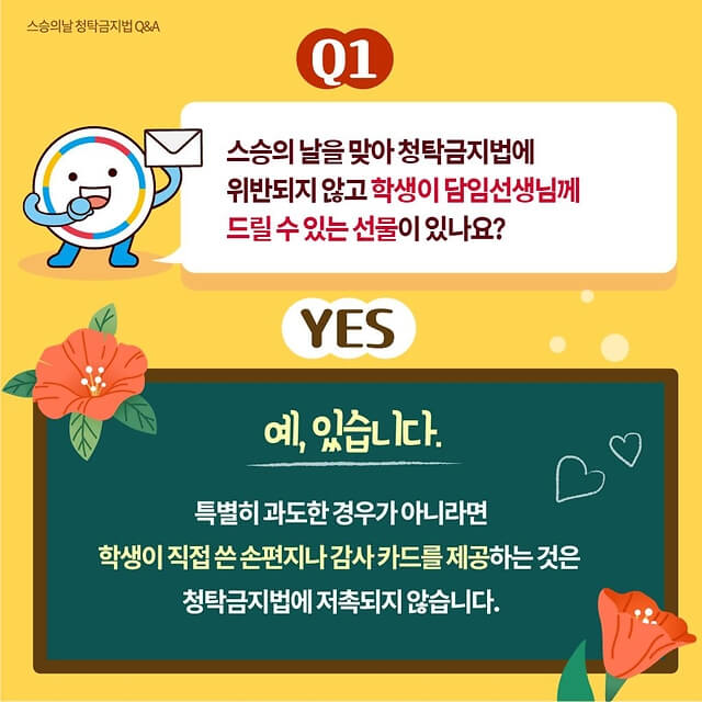 또한 특별히 과도한 경우가 아니라면 학생이 직접 쓴 손 편지나 감사카드를 제공하는 것은 청탁금지법에 저촉되지 않습니다.