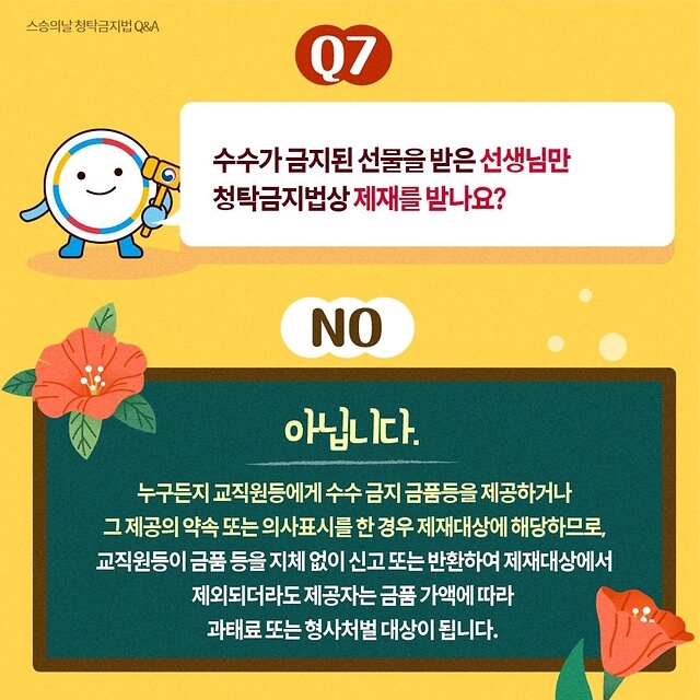 수수가 금지된 선물을 받은 선생님만 청탁금지법상 제재를 받나요?