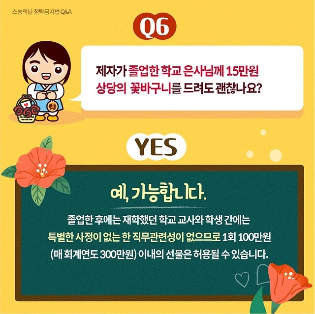 졸업한 후에는 1회에 100만 원 이내의 선물도 가능하니 참고하세요.