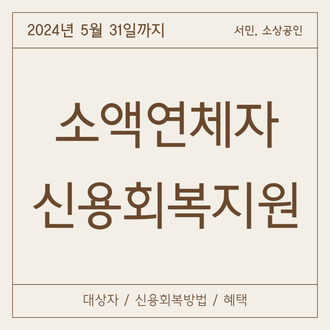 소액연체자를 대상으로 2024년 5월 31일까지 연체금액을 전액 상환할 시 신용회복 혜택을 받을 수 있습니다. 신용회복 지원을 받는다면 신용카드 발급이 가능하고, 신용평점이 상승하여 은행권에서 신규대출이 가능해집니다.